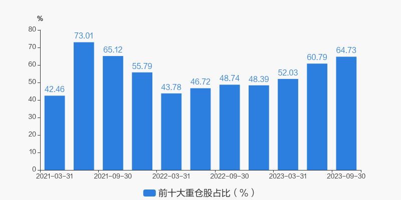 从十大重仓股情况来看,最新一期前十大重仓股占比为64.74%。