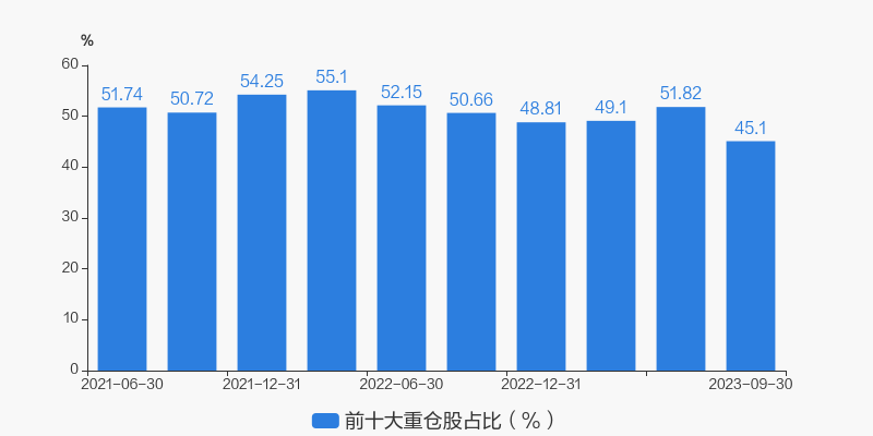 从十大重仓股情况来看,最新一期前十大重仓股占比为45.10%。