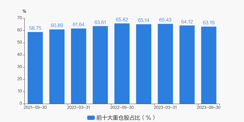 从十大重仓股情况来看,最新一期前十大重仓股占比为63.19%。