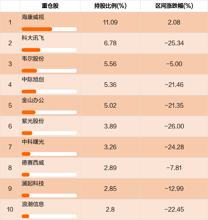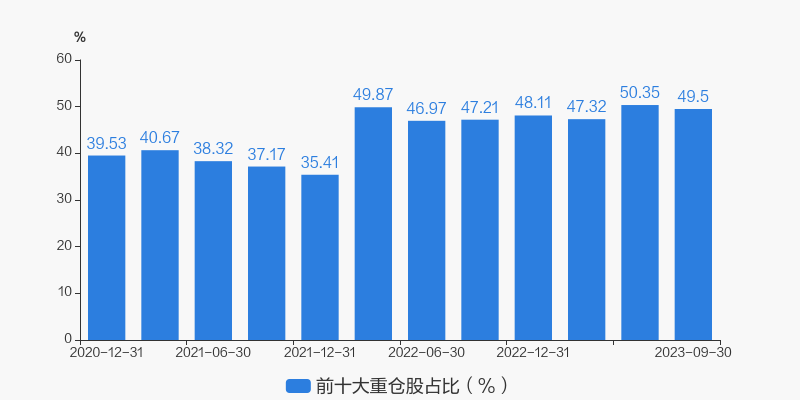 从十大重仓股情况来看,最新一期前十大重仓股占比为49.50%。