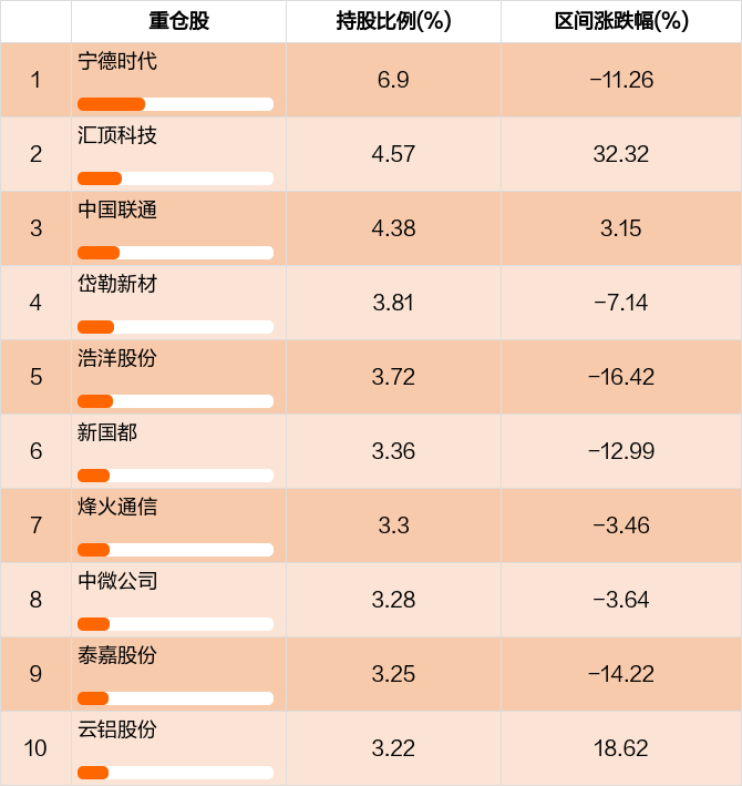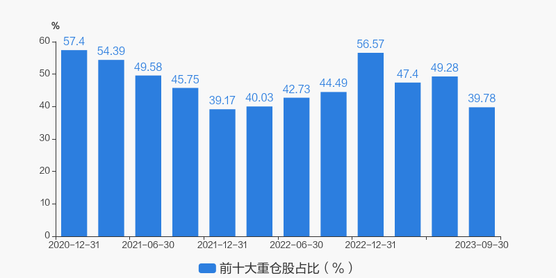 从十大重仓股情况来看,最新一期前十大重仓股占比为39.79%。