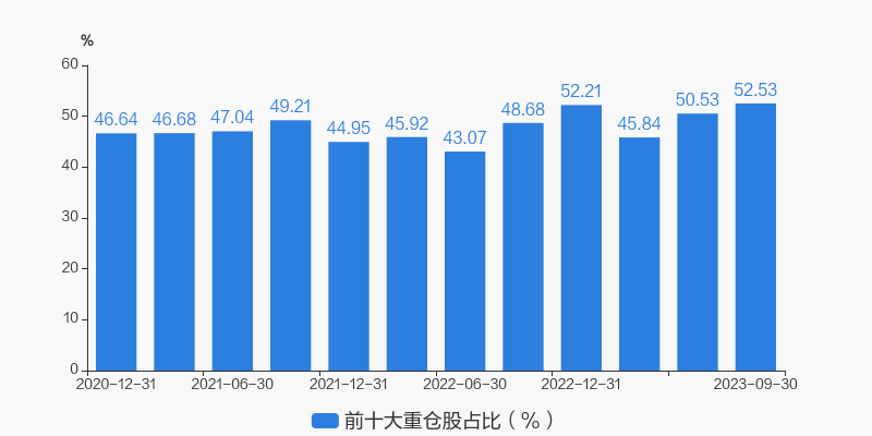 从十大重仓股情况来看,最新一期前十大重仓股占比为52.54%。