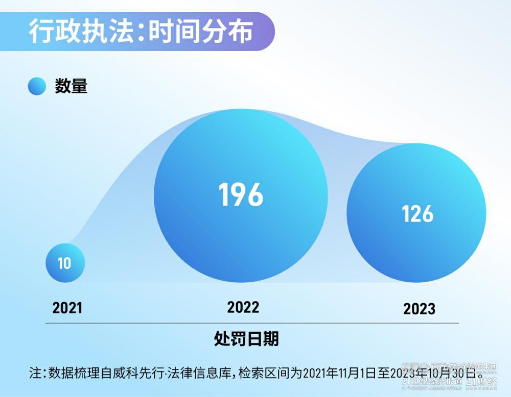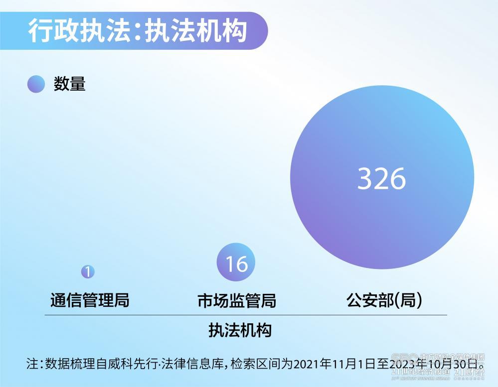 研究员在威科先行·法律信息库中检索了2021年11月1日至2023年10月30日期间所有行政执法情况,行政处罚案例共计超过300件,其中2022年行政处罚案例数量达到196件。从执法机构来看,梳理发现,这些行政处罚案件的处罚机构以公安机关为主,有超300起个人信息保护行政执法案例。