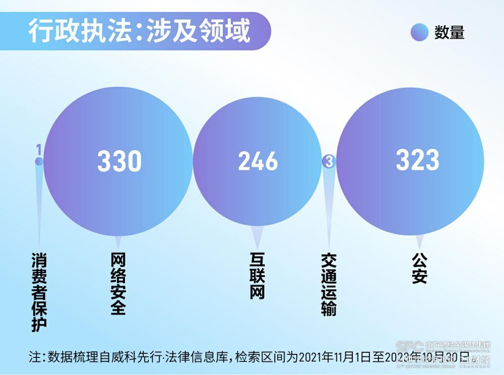 行政执法涉及的具体领域方面,研究员统计发现,主要包含“网络安全”“公安”“互联网”等关键词,其中网络安全领域相关案件高达330起,互联网领域相关案件则达246起。
