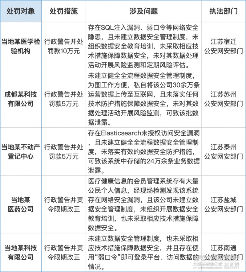 具体来看,江苏关于个人信息保护行政执法的频次与颗粒度较为领先。其中,江苏宿迁、苏州、泰州、盐城、南通等地公安网安部门,均曾对违反《个人信息保护法》的相关企业或机构处于行政警告并罚款。