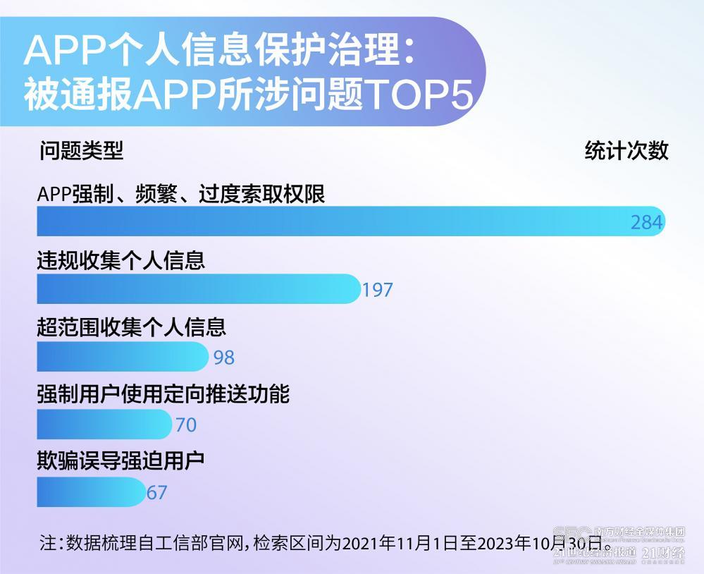 关于具体涉及的具体问题,App强制、频繁、过度索取权限的问题最为严重,在通报中共提及了284次。此外,违规收集个人信息、超范围收集个人信息、强制用户使用定向推送功能、欺骗误导强迫用户也是通报中常提到的违规问题。