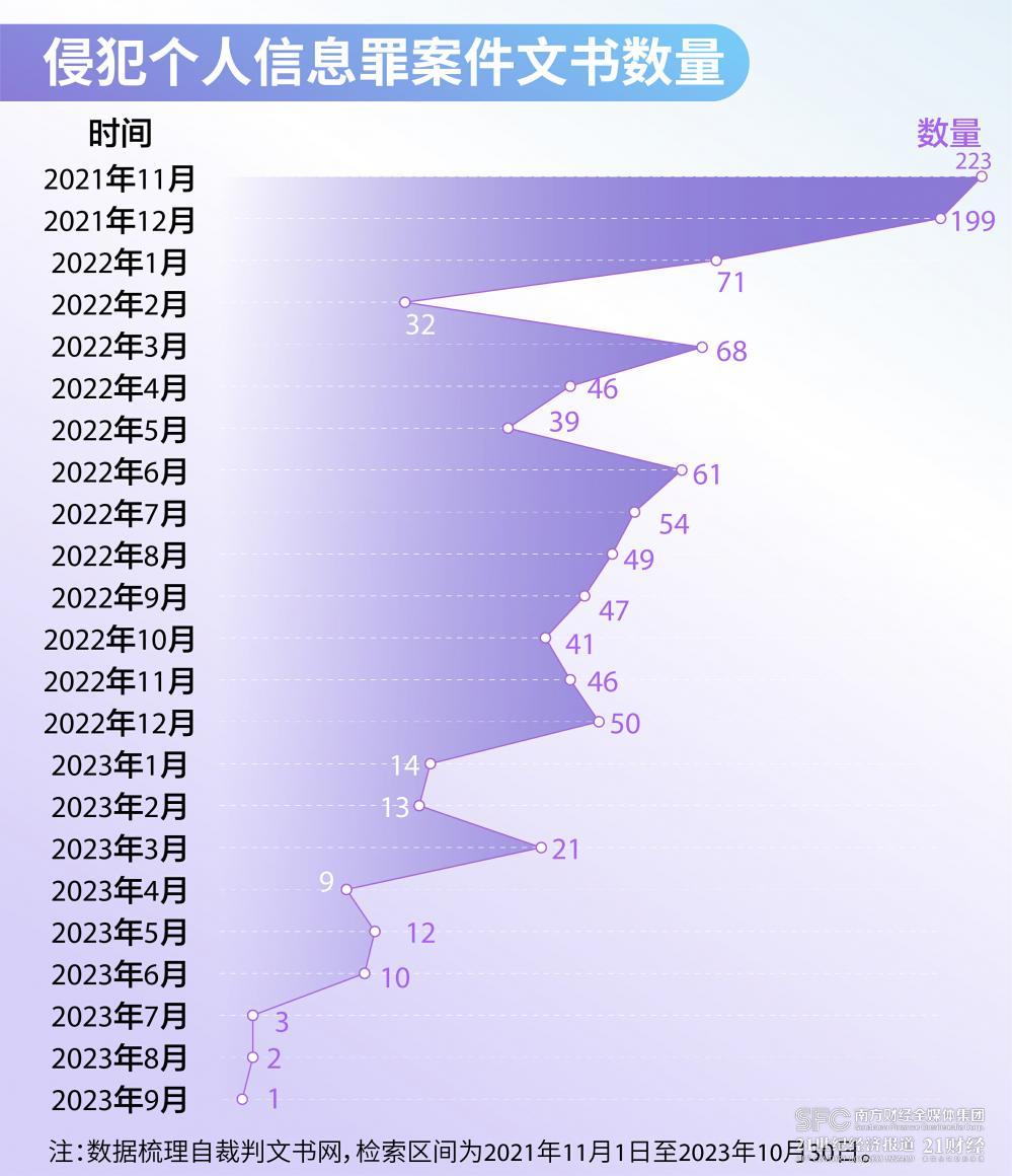 刑事案件方面,在以“侵犯公民个人信息罪”为案由检索中国裁判文书网后,数据显示,在《个人信息保护法》颁布的两年时间中,中国裁判文书网共计公开了超1000件案件文书。