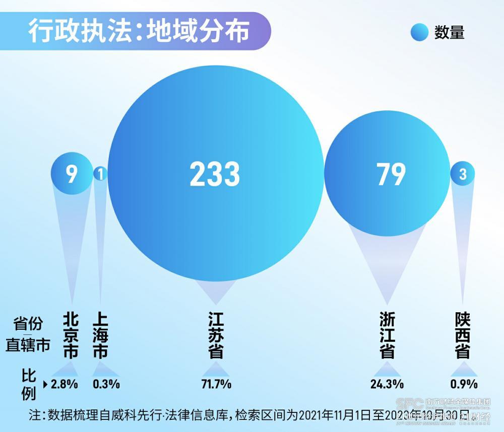 具体到行政执法的地域分布,江苏省的行政处罚案例最多,占比为71.7%。浙江省次之,占比约24.3%。