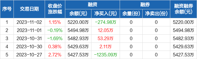 融资方面,当日融资买入442.93万元,融资偿还717.91万元,融资净偿还274.98万元。融券方面,融券卖出0份,融券偿还0份,融券余量0份,融券余额0元。融资融券余额合计5220万元。