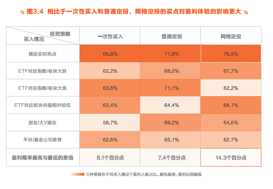 不论何种原因买入,普通定投或网络定投的盈利体验都更高,其中网格定投的买点相对重要,不同买点的盈利概率最高可相差14.3个百分点。而普通定投对于买点的要求最低,任何时点买入的盈利概率相差不大。