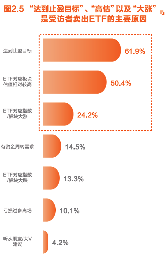 从卖出时点来看,“达到止盈目标”“ETF对应板块估值相对较高”以及“ETF对应指数/板块大涨”这三种选择人数占比最多。
