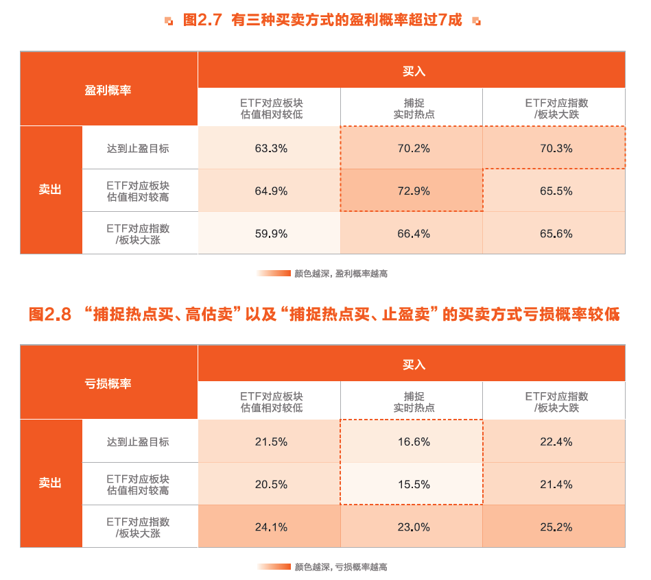 一是“捕捉热点买、高估卖”(捕捉到热点时买入并在高估值卖出,盈利概率为72.9%,亏损概率仅15.5%);