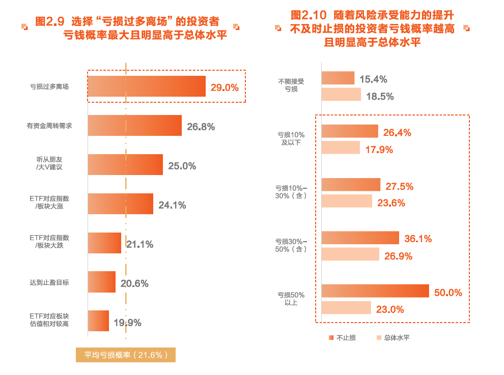 调研发现,缺少合理的止损策略将明显提高投资者的亏损概率。有10%左右的受访者会选择“亏损过多离场 ”,亏损概率近30%,明显高于21.6%的总体亏损概率。