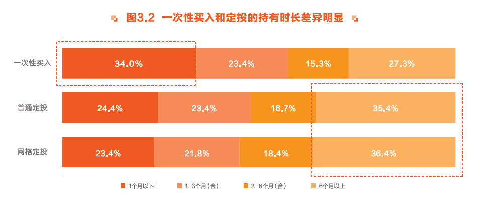 定投或网格定投体验更好的原因或许能从持有时长中窥见端倪,无论是普通定投还是网格定投,选择持有6个月以上的人数占比均较高;而采取一次性投入的投资者则更倾向于1个月内的短期投资。