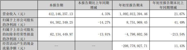 2023年前三季度,公司实现营业收入10.92亿元,同比增长21.67%;实现归属于上市公司股东的净利润875.20万元,同比增长41.49%;实现归属于上市公司股东的扣除非经常性损益的净利润-479.86万元,同比减少213.54%,经营活动产生的现金流量净额为-2.09亿元。