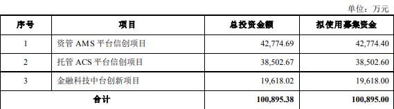 本次发行股票预计募集资金总额不超过100,895.00万元(含),在扣除发行费用后将用于资管AMS平台信创项目、托管ACS平台信创项目、金融科技中台创新项目。