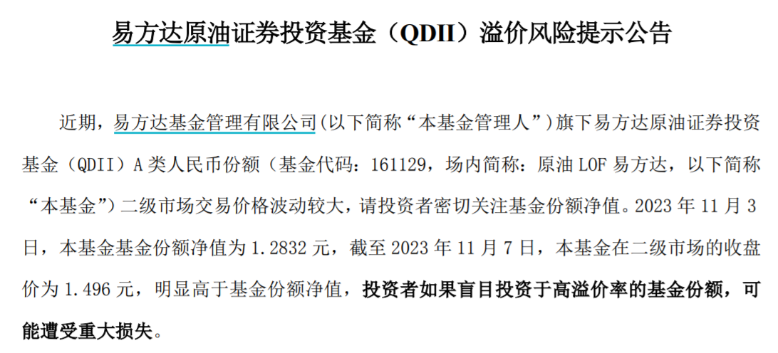 近日,多只原油主题基金出现场内高溢价,基金公司发公告提示风险。