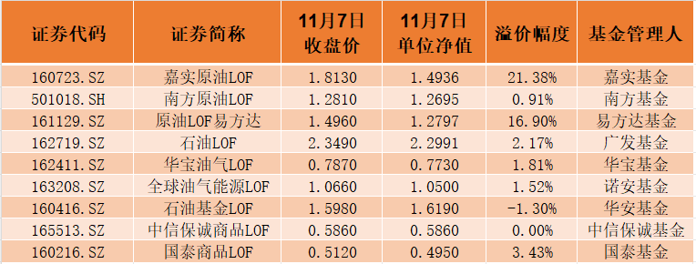 值得一提的是,澎湃新闻记者据Wind数据统计,截至11月7日,对比当日基金收盘价与单位净值,除石油基金LOF(160416.SZ)与中信保诚商品LOF(165513.SZ)外,剩余7只原油主题基金中都存在或多或少的溢价。其中,嘉实原油LOF溢价幅度高达21.38%,原油LOF易方达则紧随其后。