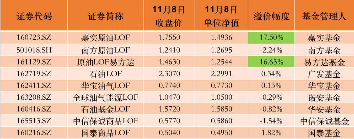 值得一提的是,澎湃新闻记者发现,对比11月7日的基金场内收盘价与单位净值,9只原油主题基金中,有7只都存在溢价,最高溢价幅度达21.38%。不过到了11月8日,上述9只基金的场内收盘价与单位净值存在场内溢价的产品数量减少至5只,嘉实原油LOF以17.50%的溢价幅度位居榜首,原油LOF易方达则以16.63%的溢价幅度位居第二。