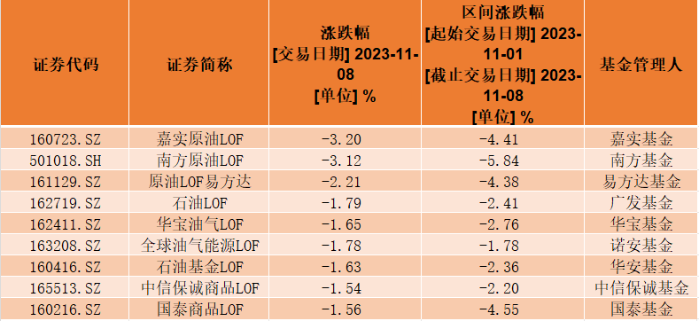 截至11月9日收盘,9只原油主题基金均仍延续跌幅态势。其中,华宝油气LOF(162411.SZ)、国泰商品LOF的跌幅超1.5%。