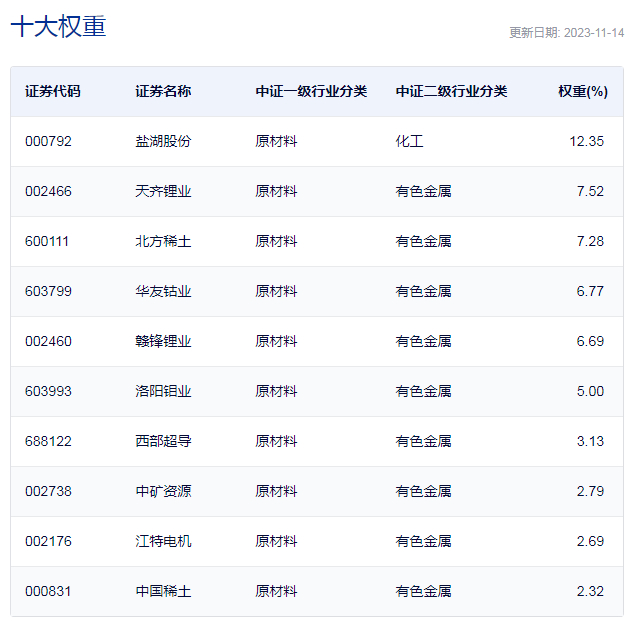 中证稀有金属主题指数在沪深市场中选取不超过50家业务涉及稀有金属采矿、冶炼和加工的上市公司证券作为指数样本,以反映稀有金属主题上市公司证券的整体表现。该指数成分股中锂、稀土和钼总市值最高,权重占比最高。