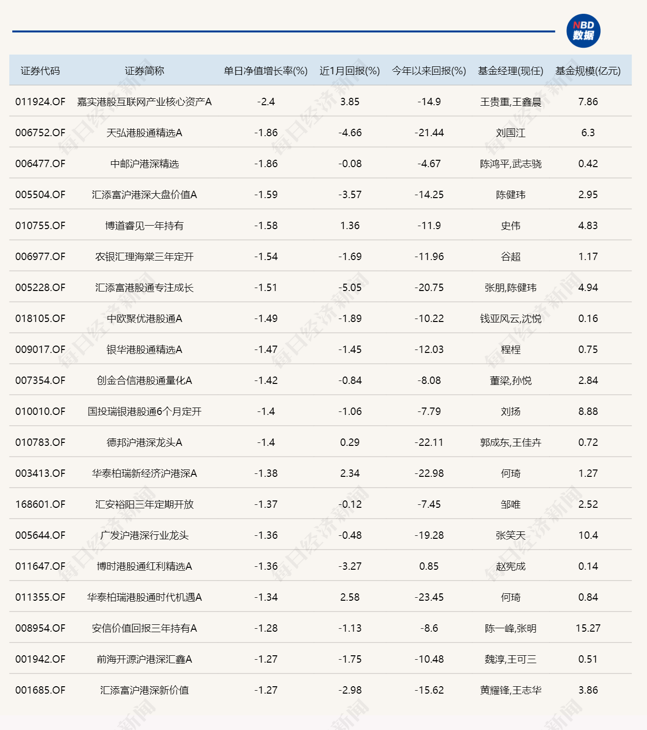 跌幅榜方面,嘉实港股互联网产业核心资产是唯一跌超2%的基金,其他TOP20产品跌幅则在1.2%到1.9%之间,它们的相同点也很突出——基本都是沪港深主题。