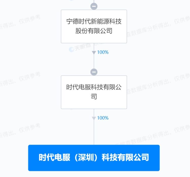 今年7月,时代电服(深圳)科技有限公司成立,法定代表人为张永灿,注册资本1亿人民币,经营范围含新能源汽车换电设施销售、人工智能应用软件开发、计算机软硬件及辅助设备零售、工业控制计算机及系统销售、数字技术服务、发电技术服务等。股权全景穿透图显示,该公司由时代电服科技有限公司全资持股,后者为宁德时代(300750)全资子公司。