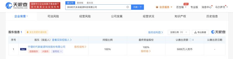 天眼查App显示,11月21日,深圳时代未来能源科技有限公司成立,法定代表人为吴映明,注册资本5000万人民币,经营范围含储能技术服务、电池零配件生产、人工智能应用软件开发、新能源汽车电附件销售、光伏设备及元器件制造、建设工程施工等。股东信息显示,该公司由宁德时代(300750)全资持股。
