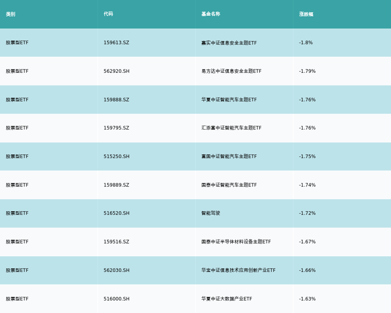 昨日股票型ETF跌幅最大的3支ETF及其收益率分别为:嘉实中证信息安全主题ETF(-1.8%)、易方达中证信息安全主题ETF(-1.79%)、华夏中证智能汽车主题ETF(-1.76%)。跌幅前10详情见下表: