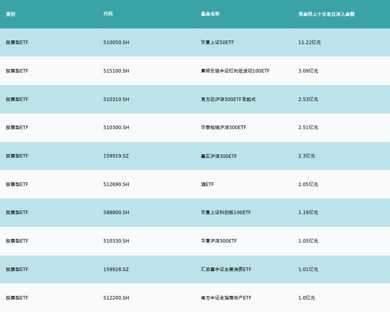 昨日股票型ETF资金流入最多的3支ETF及其流入金额分别为:华夏上证50ETF(流入11.22亿元)、景顺长城中证红利低波动100ETF(流入3.09亿元)、易方达沪深300ETF发起式(流入2.53亿元)。资金流入前10详情见下表: