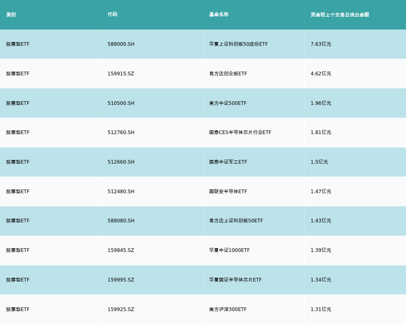 昨日股票型ETF资金流出最多的3支ETF及其流入金额分别为:华夏上证科创板50成份ETF(流出7.63亿元)、易方达创业板ETF(流出4.62亿元)、南方中证500ETF(流出1.96亿元)。资金流出前10详情见下表: