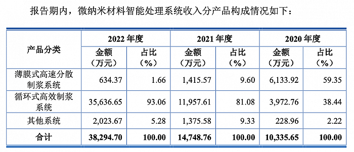 分产品来看,报告期内,公司收入主要来自于微纳米材料智能处理系统,占主营业务收入比例分别为94.52%、97.26%和96.59%,其中循环式高效制浆系统收入快速大涨,2022年同比大增196.67%,占比已达到93.06%。