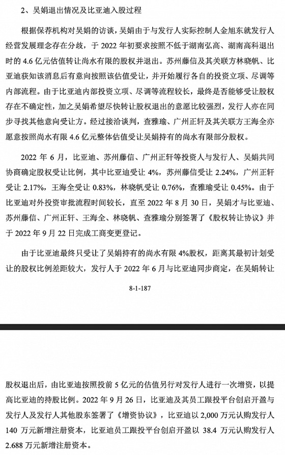 尚水智能认为,比亚迪按照5亿元的估值对公司增资并非孤立地进行增资,而是与其2022年8月按照4.6亿元的估值受让吴娟持有的部分股权构成一揽子安排,受让股权及增资所依据或参考的估值均系参考湖南弘高、湖南高科退出的估值情况、2021年业绩情况及未来发展前景而与吴娟及公司协商确定。但对于这次价差,公司认为无需计提股份支付。