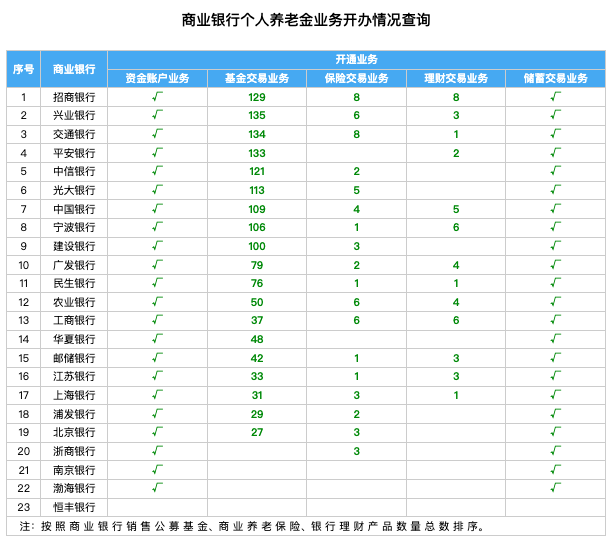 据国家社会保险公共服务平台披露,个人养老金落地一年来,各家银行均陆续开通与个人养老金相关的资金账户业务,推出个人养老金相关产品,目前,仅恒丰银行尚未开展个人养老金账户相关业务。