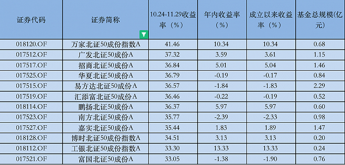 尽管指数近两日有所回调,但随着此前“狂飙”,截至目前,12只北证50成份指数基金实现了33%至42%的区间回报。这波涨幅拉动下,多只已扭亏为盈,净值回到1元以上。