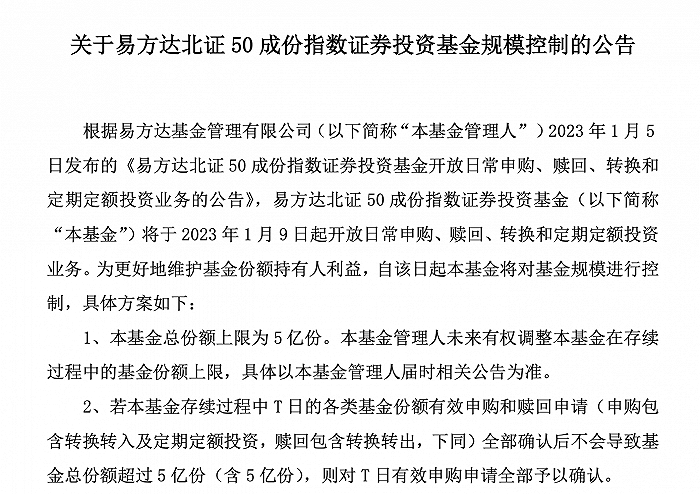 (原标题:规模被追到上限,易方达北证50暂停申购)