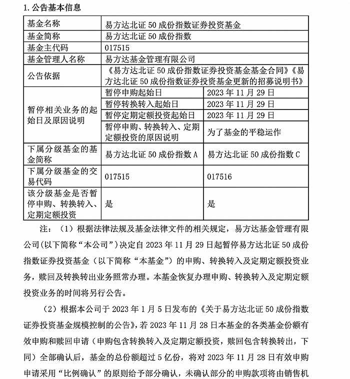 11月28日,易方达基金发布公告,决定自2023年11月29日起暂停易方达北证50成份指数基金的申购、转换转入及定期定额投资业务,赎回及转换转出业务照常办理。