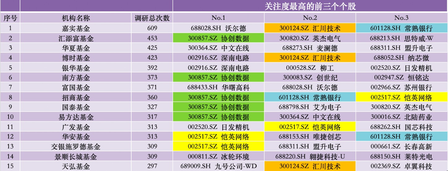 从关注度最高的前三只个股来看,协创数据(300857.SZ)、恺英网络(002517.SZ)、汇川技术(300124.SZ)、常熟银行(6001128.SH)出现的频率最高。