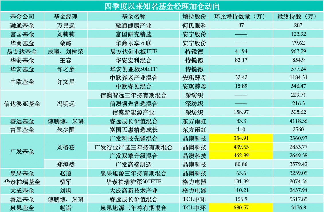 四季度以来,随着上市公司陆续发布回购股份公告,多位知名基金经理的加仓动向也相继浮出水面。其中,晶澳科技、安琪酵母、TCL中环等个股被多位基金经理布局。