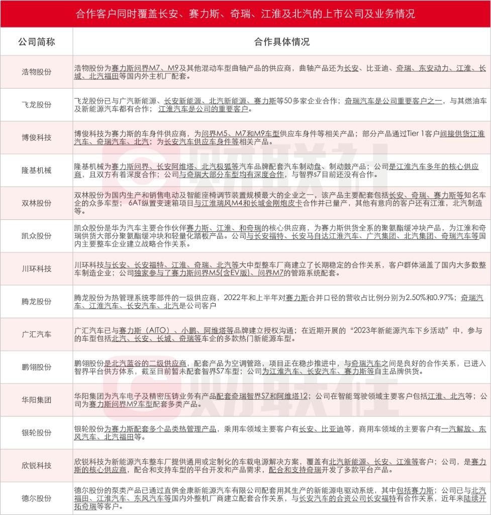 据财联社不完全整理和统计,包括浩物股份、飞龙股份、博俊科技、隆基机械、双林股份、凯众股份、川环科技、腾龙股份、广汇汽车、鹏翎股份、华阳集团、银轮股份、欣锐科技、德尔股份在内的累计14家上市公司合作客户同时包括江淮汽车、长安汽车、赛力斯、奇瑞和北汽。其中,浩物股份曲轴产品为长安、江淮等主机厂配套;隆基机械为长安阿维塔配套汽车制动盘、制动鼓产品,且公司是江淮汽车多年的核心供应商;欣锐科技车载电源解决方案客户覆盖长安、江淮等。