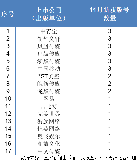 据时代周报记者统计,11月获批的国产网络游戏共涉及20家上市公司,其中17家上市公司作为出版单位新获国产网络游戏版号,另3家上市公司作为运营单位新获国产网络游戏版号。