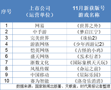 从游戏运营单位来看,有10家上市公司旗下运营的游戏获得版号,其中包括游网易的《世界之外》、中手游(0302.HK)的《梦启江宁》、完美世界的《诛仙2》、游族网络的《少年西游记2》、恺英网络的《古怪的小鸡》、盛天网络(300494.SZ)的《炁术行者》等。