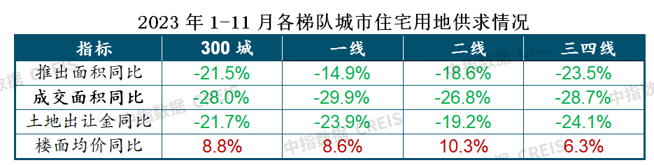 销售端的走弱也反映到了土地市场。1-11月,全国300城住宅用地推出、成交面积同比分别下降21.5%、28.0%,仅部分城市或个别地块热度较高,整体低迷态势未改。至11月末,除北京、上海、深圳外,多数城市已取消土地最高限价,但仅少量核心城市优质地块拍出高溢价,整体热度仍较低。