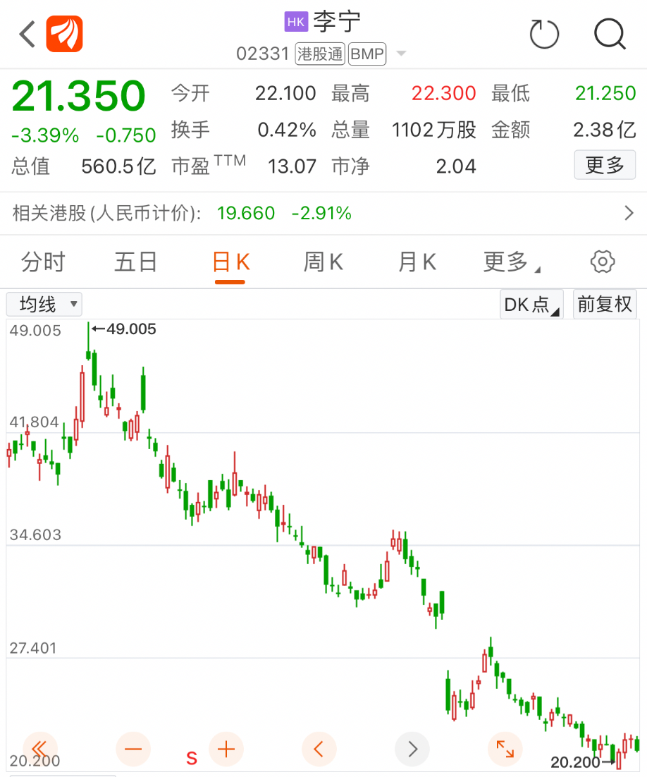 在二级市场层面,李宁的股价变现并不尽如人意。截至最新收盘,李宁股价报21.35港元,年内累计跌幅达68%,总市值缩水至560.6亿港元,仅为安踏总市值的25%。