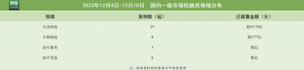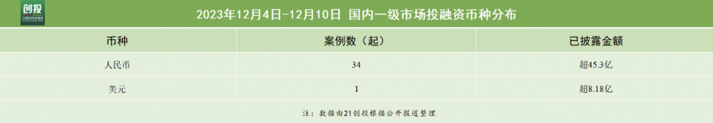 21创投不完全统计,12月4日—12月10日,报告日期内国内一级市场发生融资事件51起。其中,35起融资披露了融资金额和币种信息,总规模超45.3亿元人民币。