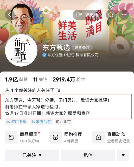 12月16日凌晨,东方甄选官方抖音账号更新简介,宣布当天暂时停播。“闭门思过,敬请大家批评!俞老师在带领大家进行检讨。12月17日准时开播,感谢大家的厚爱和宽容!”