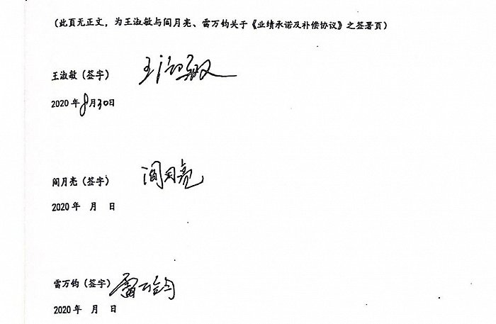 该《业绩承诺及补偿协议》的落款时间为2020年8月30日,其中在第三页签署页有“王淑敏”和“阎月亮”的签名。