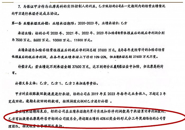 而如果业绩超出承诺,阎月亮有权提请北摩高科召开标的公司股东会,将超额业绩的40%以奖金的形式分三年奖励给标的公司管理团队,相关税费由管理团队承担。