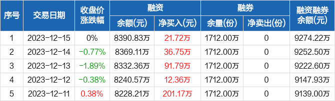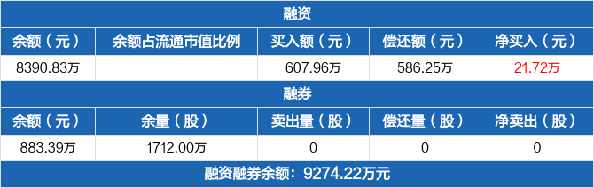 融资方面,当日融资买入607.96万元,融资偿还586.25万元,融资净买入21.72万元,连续6日净买入累计453.21万元。融券方面,融券卖出0份,融券偿还0份,融券余量1712万份,融券余额883.39万元。融资融券余额合计9274.22万元。
