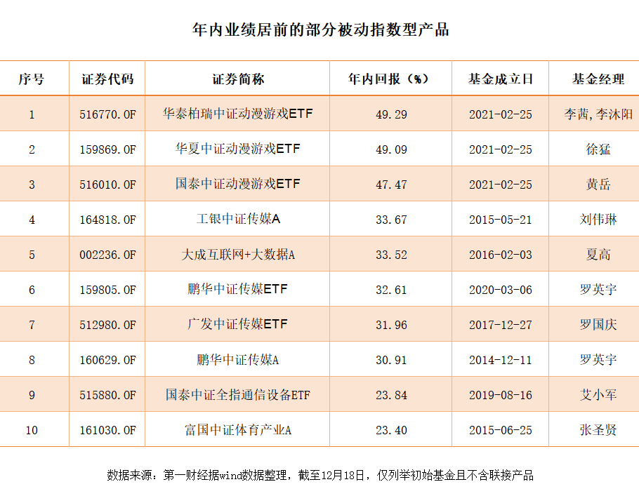 据第一财经统计,若剔除今年成立的新基金且仅计算初始基金、被动产品中不含联接产品,截至同日,业绩表现最好的指数产品是华泰柏瑞中证动漫游戏ETF,今年以来的累计回报为49.29%;华夏中证动漫游戏ETF、国泰中证动漫游戏ETF则分别以49.09%、47.47%的年内表现紧跟其后。
